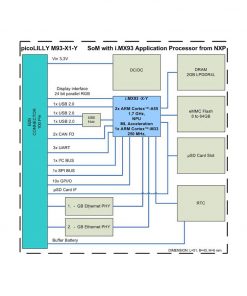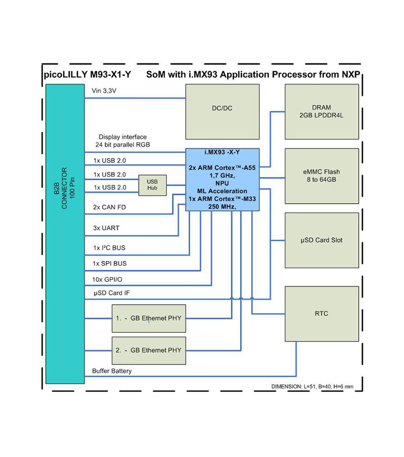 SoM with i.MX93 CPU SC 1.7GHz, DRAM 2GB, eMMC 8GB with 100 pin system bus IF connector |